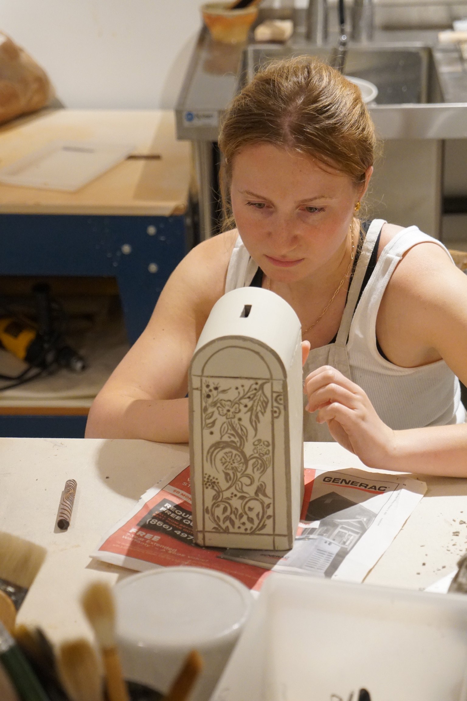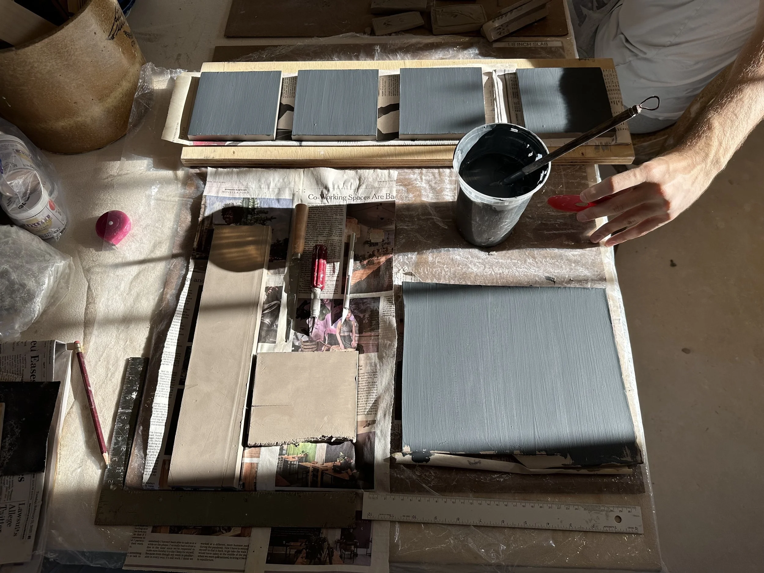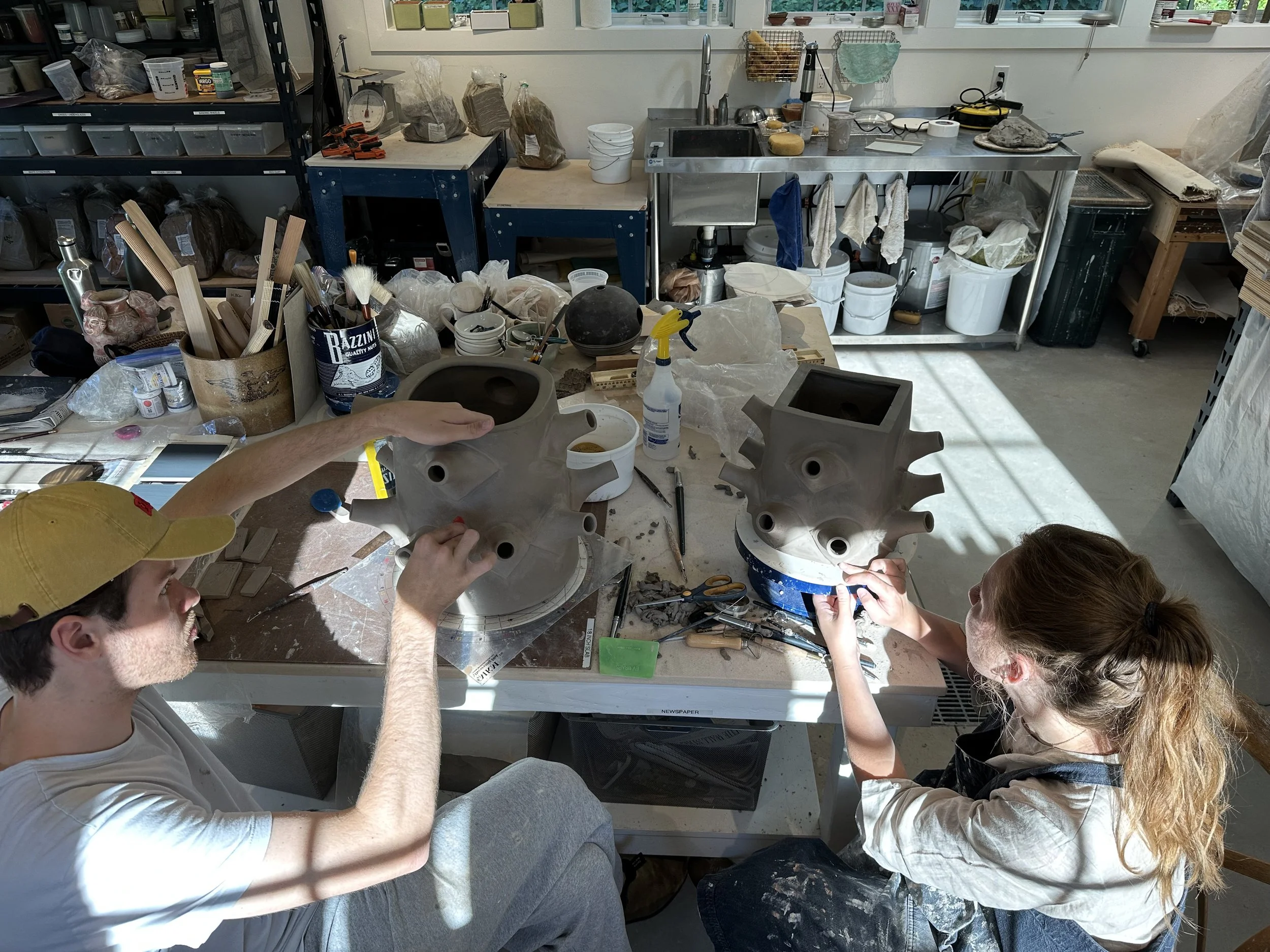 This summer we decided to make Judaica, including two tzedakah boxes, two Kiddush fountains, and Shabbat candlesticks. These are our most architecturally advanced pieces to date; the channels for the wine pour for the fountain and the vaulted lids for the boxes posed new challenges in building. Once we successfully assembled them, we added and carved sculptural detailing onto each surface.