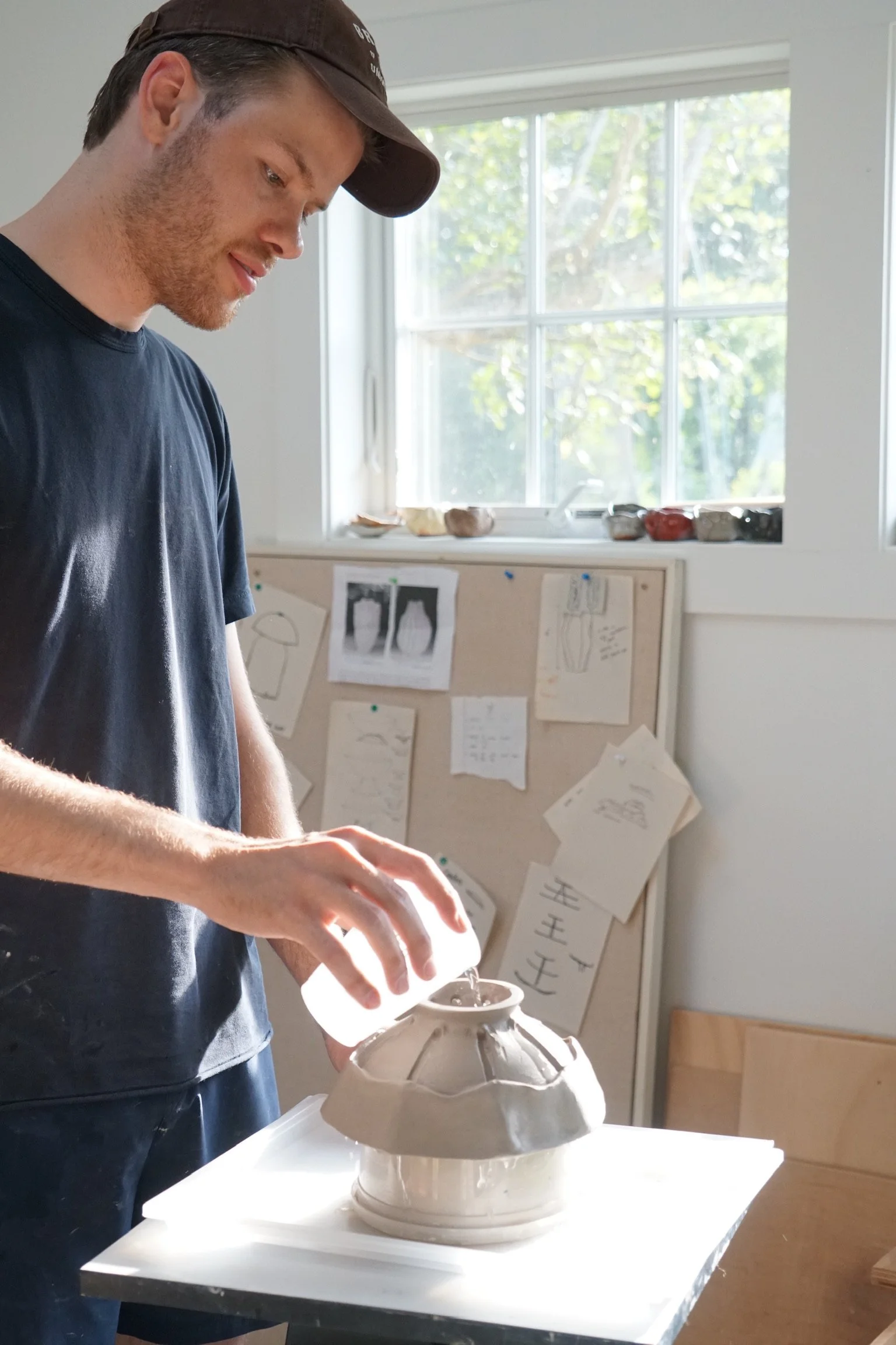 We prepared for an Anagama wood firing with pieces that would reflect the natural patterns of the ash and flames, producing a Sodeisha-inspired vessel and lamp base.